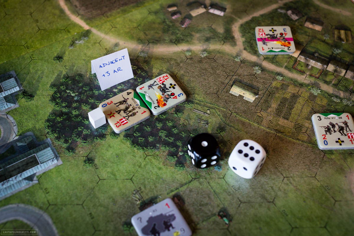 Yllä: Puskissa pönöttävä NKVD-erikoisyksikkö yrittää tuhota pioneerit. Niin sanottuja ”pehmeitä kohteita” vastaan heillä on tulivoimaa 3 (punainen luku nappulan vas. alakulmassa) sekä bonus +3 lähietäisyydeltä. Nopat antoivat 7, joten lopputulos on 3+3+7=13, mikä riittää satuttamaan noita kohteena olevia arjalaisia ”matuja”, sillä heidän suojalukunsa on 12 (oik. alakulma). Lisäksi ryhmä on puutalon suojissa, mistä saa yhden lisäpisteen. Lopputulos 13 vs 13 riittää nipin napin satuttamaan. Ryhmä pysyy kuitenkin iskukykyisenä ja eliminoi NKVD-yksikön tämän jälkeen.